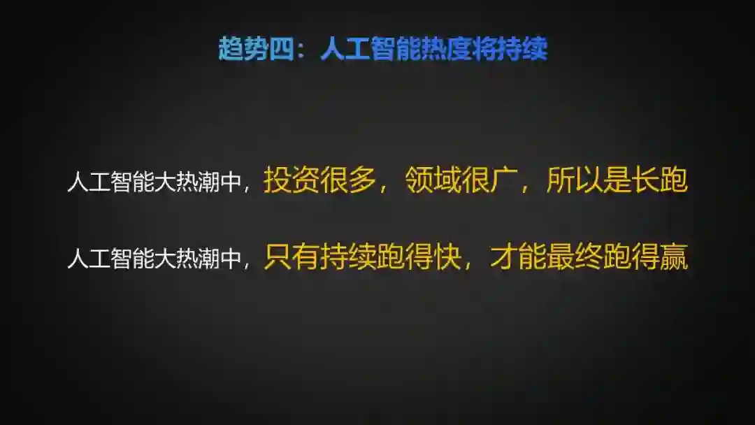 第四个趋势是,从国家规划、技术发展、重大投资等各个角度看,人工智能的热度应该还会持续很长时间,这是一个长跑的过程,但同时只有持续跑得快才能最终跑得赢,这是一个人工智能大热的情况下必须采取的基本态度。