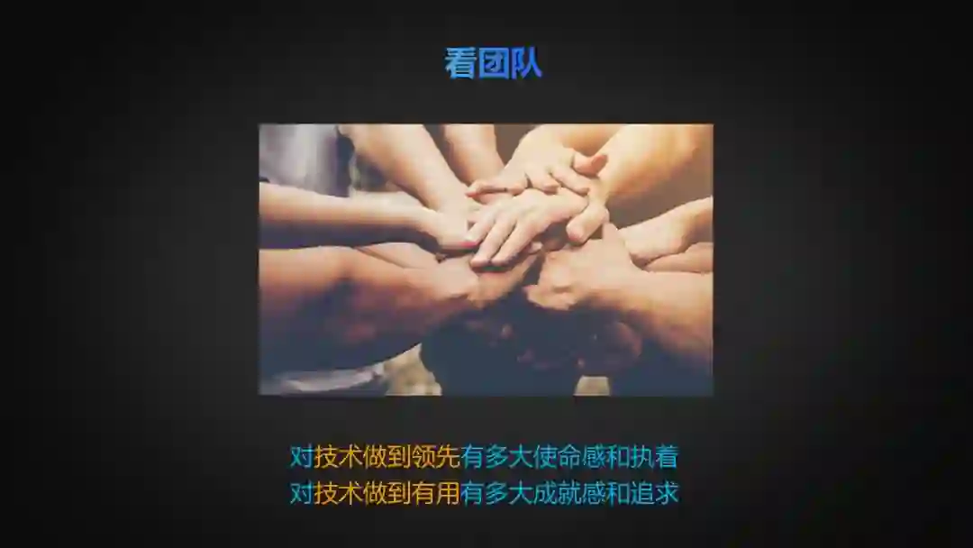 第三就是看团队。现在的投资方评估技术团队,特别看重该团队对技术做到领先有多大的使命感和执着,是否有死活不服别人在比赛上或其他方面超过我的精神。另外就是评估团队对把技术做到有用有多大的成就感和追求。如果这个团队中的人更关注发论文升教授升研究员,那这就不是投资者从技术产业投资角度出发会关注的团队。