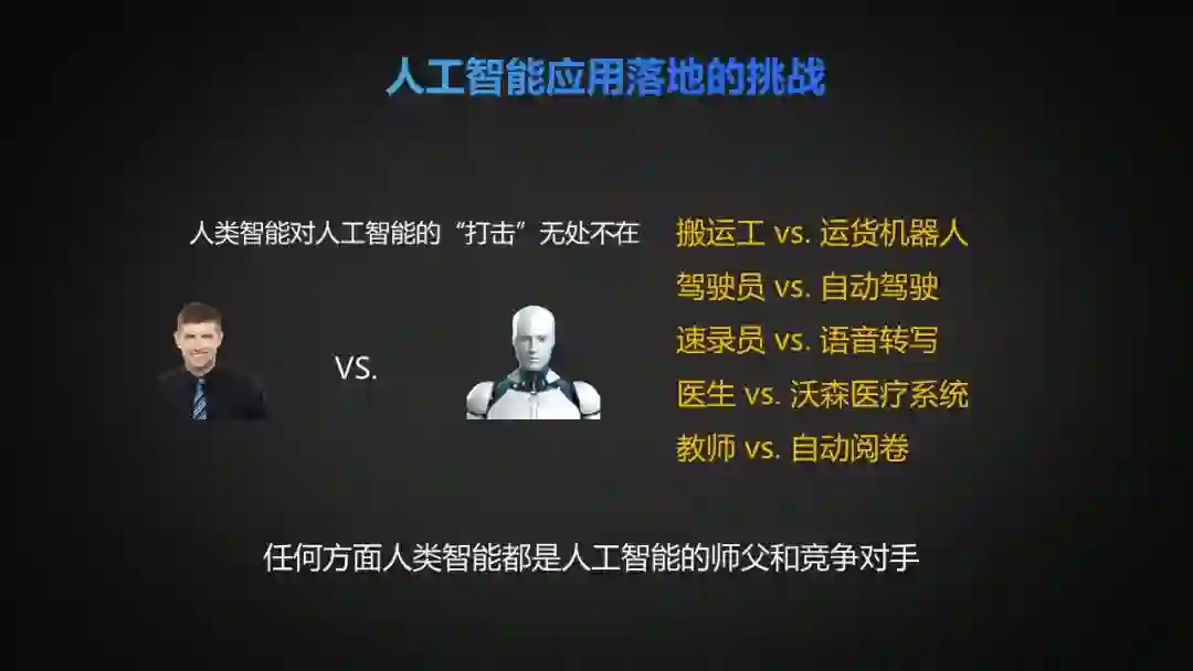 人工智能应用落地的挑战在于人类智能对人工智能的“打击”无处不在,我们做人工智能技术,做人工智能落地,面对的竞争对手不仅是别的技术提供商,还有人类自身。