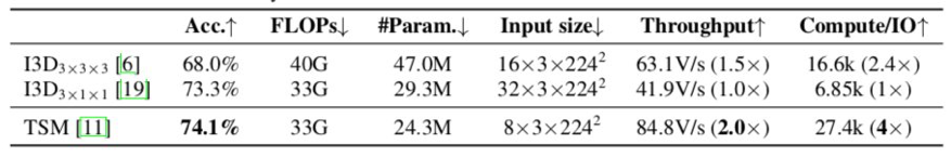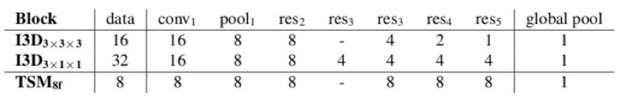 表 2:每个块的输出特征图的时间分辨率。TSM 是全 2D 结构,具有最佳的硬件效率。I3D3×3×3 的最后几个阶段的时间分辨率更低,这使其更接近 2D CNN,因此相比于 I3D3×1×1 有更好的硬件效率。