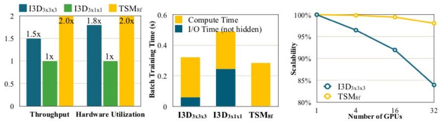 相比于之前的两种 I3D 模型,TSM 模型在当前引领世界的 Summit 超级计算机上可实现分别高 1.6 和 2.9 倍的训练吞吐量。