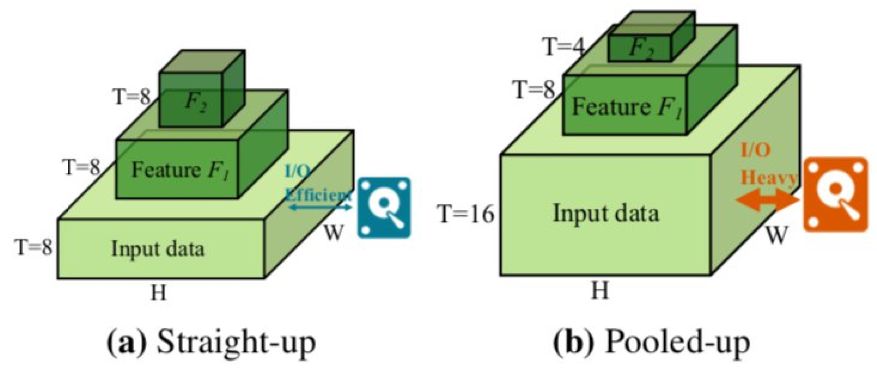 图 2:两种类型的视频主干设计。(a) 没有时序上的池化,对数据的利用更加高效。(b) 需要更多的输入帧数,对 I/O 造成了压力。