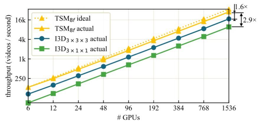 图 6:分布式同步 SGD 训练的吞吐量和可扩展性。甚至当使用 1536 个 GPU 时,TSM8f 也能实现很好的可扩展性(>80%)。TSM8f 的训练吞吐量比 I3D3×3×3 高 1.6 倍,比 I3D3×1×1 高 2.9 倍,这表明新提出的设计原则是有效的。