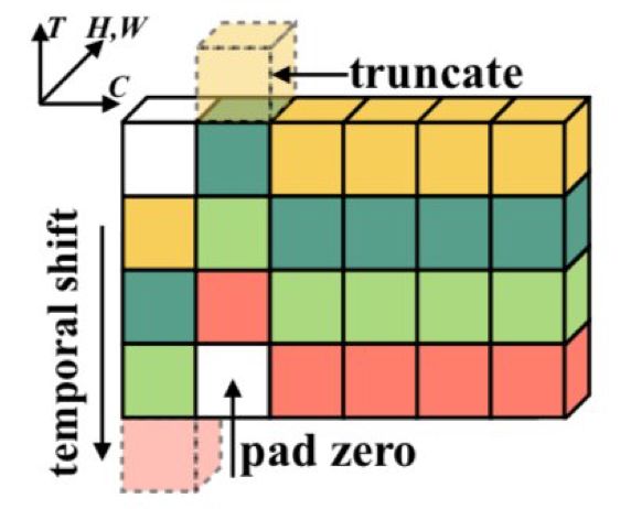 图 1:时间位移模块(TSM)会沿时间维度位移通道,从而实现近邻帧之间的时间建模