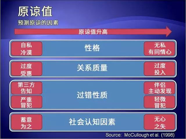 科学研究发现,“原谅”这件事,男女也有别:男人更容易原谅精神出轨,而女人更容易原谅肉体出轨[5](面对出轨,你更害怕失“身”,还是失“心”?)。总的说来,无论男女,某些性格、社会和关系特征,会使一个人更加呈现“原谅体质”。所以如果你是个花花肠子,在寻找伴侣的时候,不妨参考一下下图[6];而如果你原谅值爆表……只能祝你幸福了。
