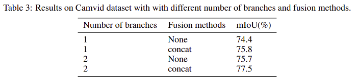 模型架构中使用的分支数和融合方法对IOU的影响如表3所示。