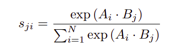 假设给定一个局部特征C,我们将其输入一个卷积层,分别生成两个新的特征图B和C。对A与B的转置进行矩阵乘法,应用softmax层计算空间注意力图,定义如下式: