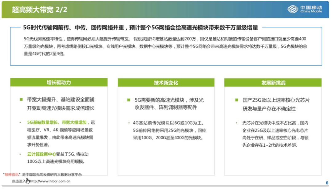 中国移动投资公司在《洞见 5G,投资未来》的报告里也曾做过测算。测算认为,假设我国 5G 宏基站数量达到 200 万,则仅是基站和对接的传输设备客户侧的接口就至少需要 400 万量级的光模块,再考虑线路侧接口光模块、专线用户光模块、数据中心光模块等,预计整个 5G 网络会带来高速光模块需求将达数千万量级,5G 光模块的总 量是 4G 时代的 2 至 4 倍。