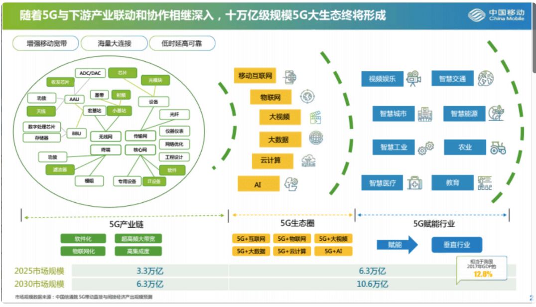 上游基建、终端供应链端的红利相比之外,更多的下游应用被寄予了更高的期望。《洞见 5G,投资未来》的报告测算,上游的基建投入规模在 2025 年或达到 3.3 万亿元,下游应用则有望达到 6.6 万亿元;到 2030 年,这两个数字或达到 6.3 万亿、10.6 万亿,后者约是 2017 年中国 GDP 的 12.8%。