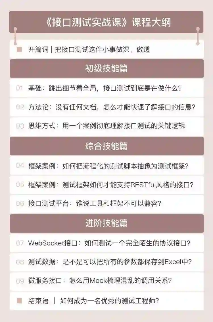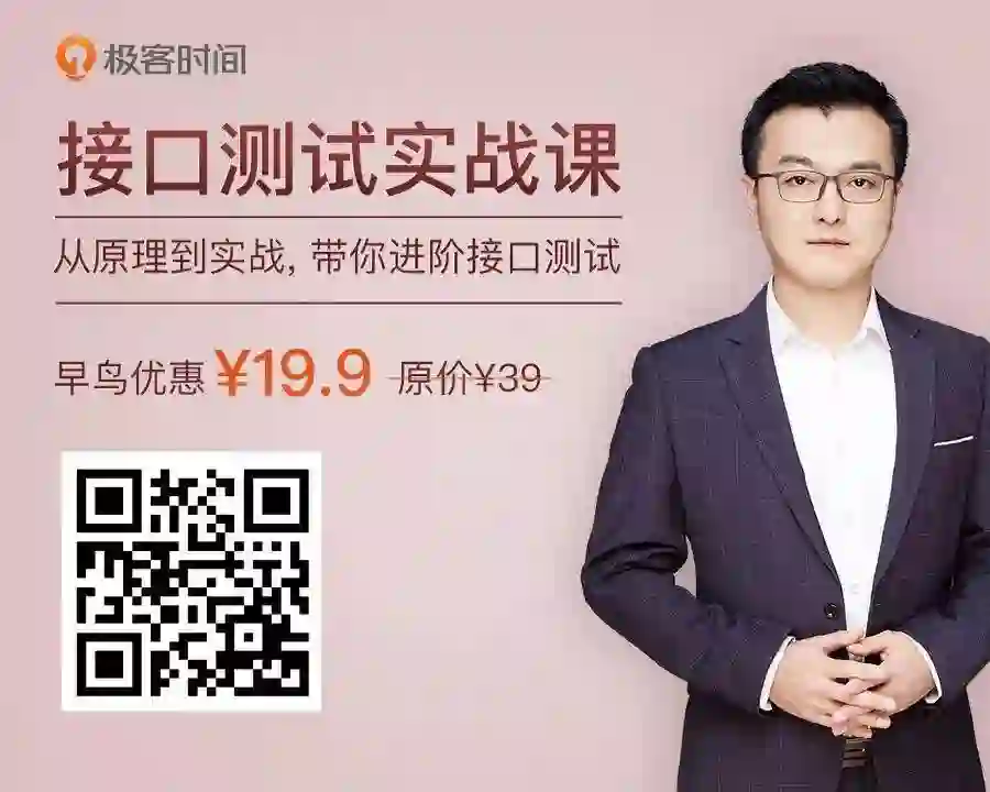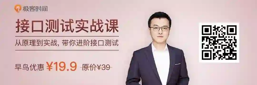 因此我和极客时间合作了《接口测试实战课》专栏,从接口测试的思维开始,教你把业务测试的思维和接口测试的技术结合到一起,合成接口测试的思维,最终让你拥有接口测试的能力,这种能力既包含了工具的使用、代码的编写同时也包含用例的设计等。