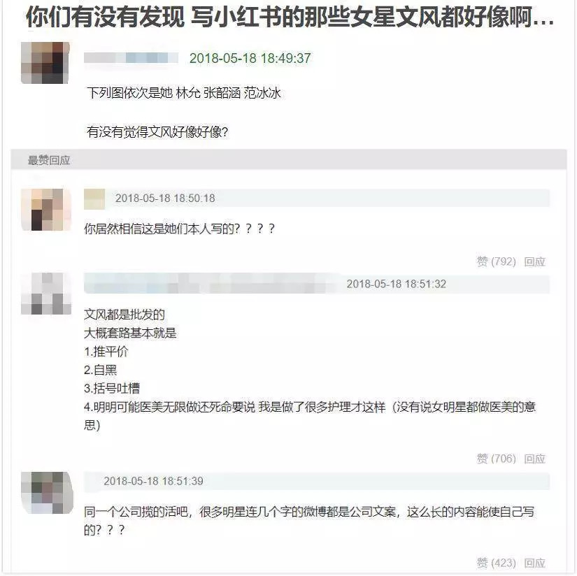 有小红书用户对虎嗅反应,会有疑似“水军”的用户在小红书里引导舆论,而质疑广告的评论会遭删除。此外,在小红书之外,也早已出现对明星广告的议论。
