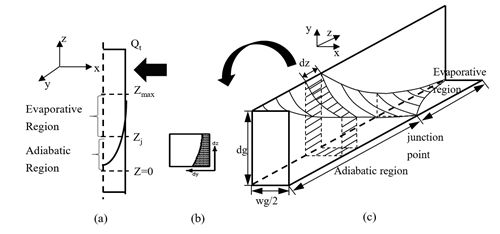 然而在较高热流密度条件下,随着热流密度的不断升高,微槽群内的液体工质将极易干涸,如果干涸持续发生,液体工质无法及时补充,扩展弯月面上的高强度蒸发将无法发生,高强度的复合相变换热也无法进行,微槽群热沉的换热能力受到极大的恶化。因此,研究液体工质沿微槽在扩展弯月面上的润湿及流动特性对分析及改善微槽群复合相变换热能力具有关键作用。