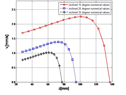 图3 微槽内液体沿随倾角变化在不同润湿高度的流速
