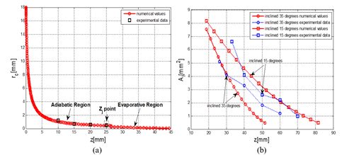 图2 曲率半径(a)和润湿面积(b)随润湿长度变化的数值结果与实验结果的对比