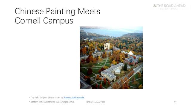 从激活矢量的角度来说,我们去不断寻找激活矢量就能够反推出这个图像。如果把这个图像放到卷积神经网络中,激活矢量就会组成一个矩阵,我们称之为图像的风格。这个矩阵之所以和风格有关系,是因为它能够告诉你与它比较相近的的风格或者特点。卷积神经网络可以帮助我们实现图片的风格迁移,比如说以康奈尔大学这张图片作为原始内容,把这张中国画作为风格信息,这两者相组合就能够出来不同的风格效果。