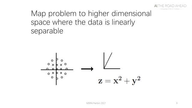 现在的问题就是,有多少状态是可以进行线性分割?实际上这个数量并不多。这时我们就需要把这些数据映射到更高维的空间,然后再来解决这个问题。我给一个简单的例子来向大家展示一下我们怎么样实现映射。原始的数据是二维的,我把它称为X&Y,现在我要做的就是要把这个数据映射到一个三维的空间。我有一个Z轴,而Z轴的值将会是X平方加上Y平方,它可以实现的就是把一些元素从平面上拿出来变成立体的,这样你就可以看到这些数据可以用一个跟之前平面平行的平面来进行分割。这是一个非常简单的例子,但是它就是我们所谓的支持向量机的工作原理。