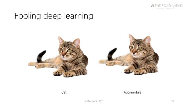 上图所示有两只人眼看来几乎没有区别的猫,左边的猫能够被正确识别出来,但右边的却被错误识别为汽车,原因就是右边的图改动了几个像素,导致了深度神经网络的识别错误。因此尽管深度神经网络可以在某些特定的任务特定的数据集上达到甚至超过人的水平,但是它并不是真正的人工智能,距离人的智能还有很长的路要走。