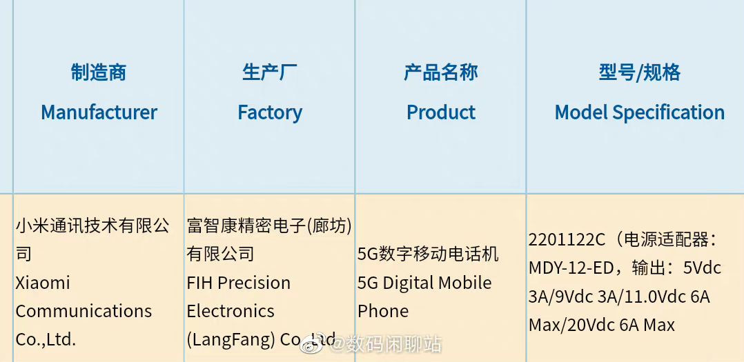 据最新消息显示,小米 12 系列首发 3 款手机已经入网,其中小米 12 型号为 2201123C,小米 12 Pro 型号为 2201122C,小米 12X 型号为 2112123AC。今日 3C 页面的充电器认证信息显示,型号为 2201122C 的小米 12 Pro 已通过认证,并且确认支持 20V 6A 120W 快充。