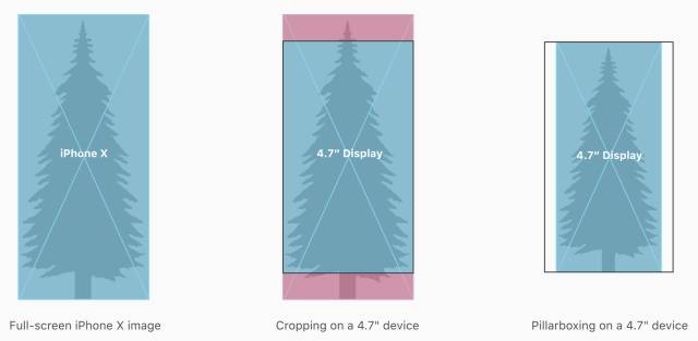 在重复使用现有图稿时,请注意长宽比差异。iPhone X 与常规 iPhone 的屏幕长宽比不同,因此,全屏的 4.7 寸屏图像在 iPhone X 上会出现裁切或适配宽度显示。同理 iPhone X 的图片在 4.7 寸屏上也会出现此情况。所以,重要的视觉稿请根据设备型号做相应的调整。