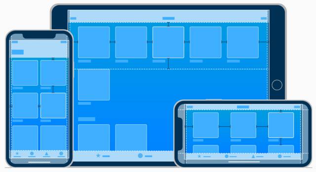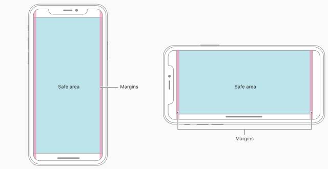 对于使用自定义布局的应用,如果想要适配 iPhone X 也比较容易,特别是当应用使用了响应式布局(Auto Layout)时,请参考下方提供的安全区和边距布局规范。