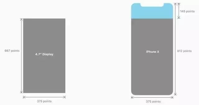 iPhone X 的屏幕宽度同 iPhone 6、iPhone 6s、iPhone 7 和 iPhone 8 的 4.7 英寸屏幕宽度相同,即 375pt。垂直高度上增加了 145pt,这意味着增加了 20% 的可视空间。