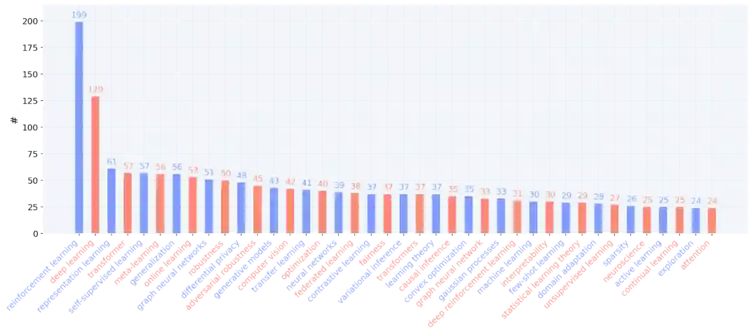 所以,实际上涉及Transformer的论文数量为94篇,仅次于强化学习的199篇和深度学习的129篇,位列第三。