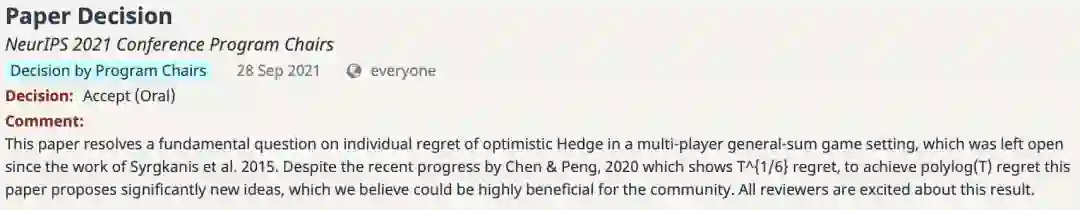 平均得分最高的论文是来自麻省理工的「Near-Optimal No-Regret Learning in General Games」。