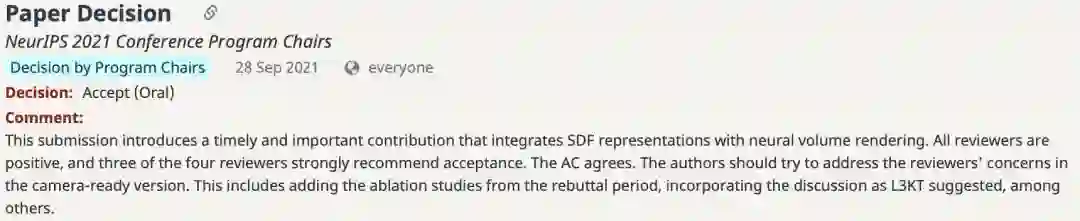 这篇论文介绍了一个及时而重要的贡献,将SDF表征与神经体积渲染相结合。四个审稿人中的三个强烈建议接受。作者应该努力解决审稿人所关注的问题。这包括加入反驳期的消融研究,纳入L3KT建议的讨论等。