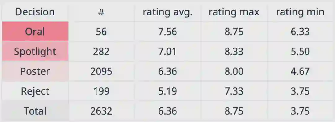 要获得最高的Oral意见,平均得分达到了7.56分,最终审稿人给出的决定中,只有56个Oral,仅占全部审稿意见总数的2.1%。