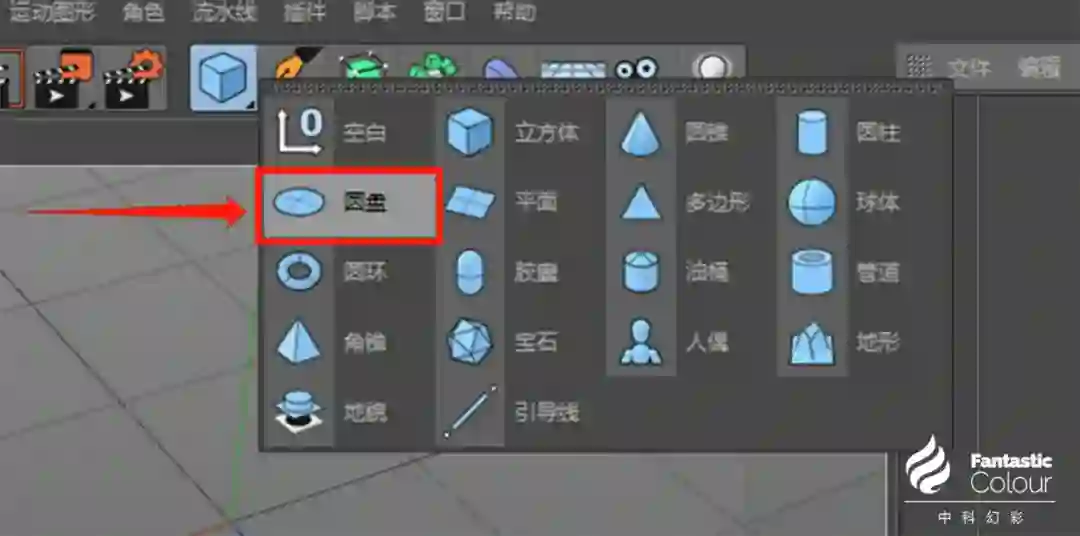 打开C4D添加对象:【圆盘】,找到下图物体图标,鼠标长按左键选择添加【圆盘】工具。如图1、图2所示: