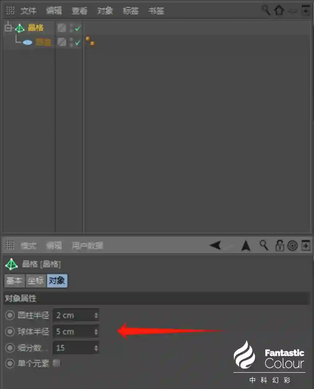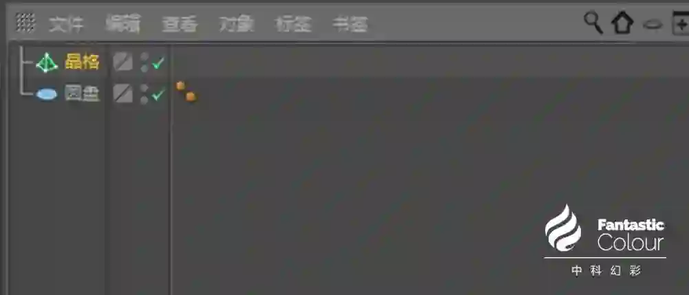 在【对象】窗口中,把【圆盘】按住鼠标左健,拖拽进【晶格】的子层级里直到出现向下的小箭头松开即可。如图8所示: