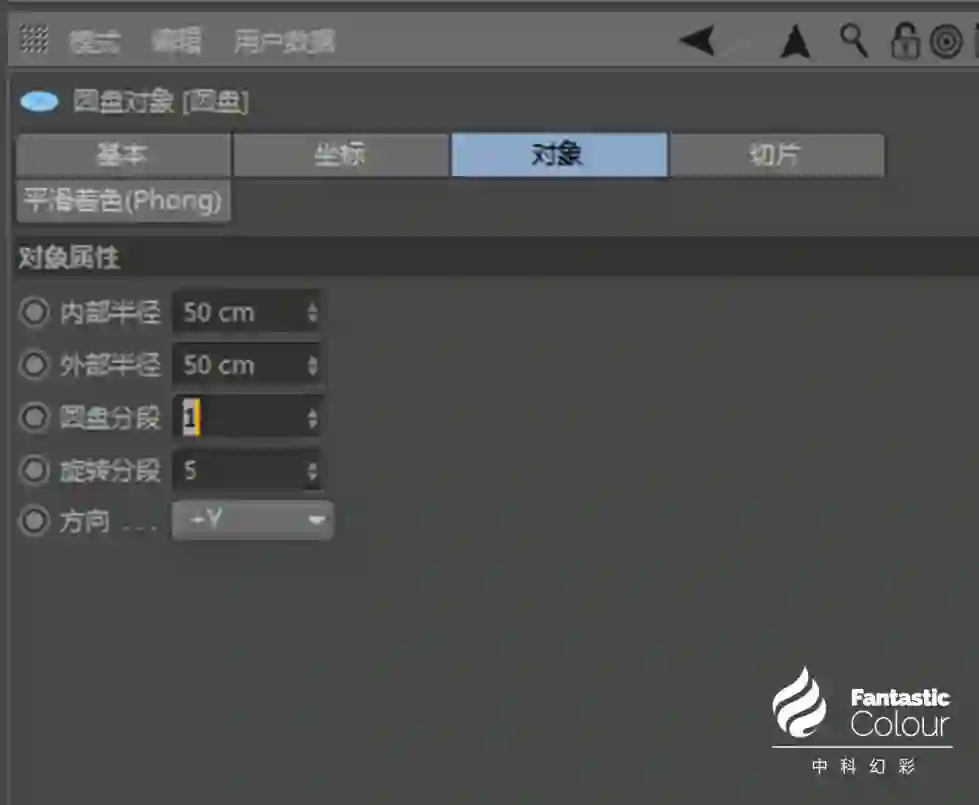 在【对象】窗口中选中【圆盘】在【属性】窗口中设置,将圆盘分段设置为1,旋转分段设置为5内部半径跟外部半径大小都设置为50cm,并在【显示】中选择【光影着色(线条)】。如图3、图4、图5所示: