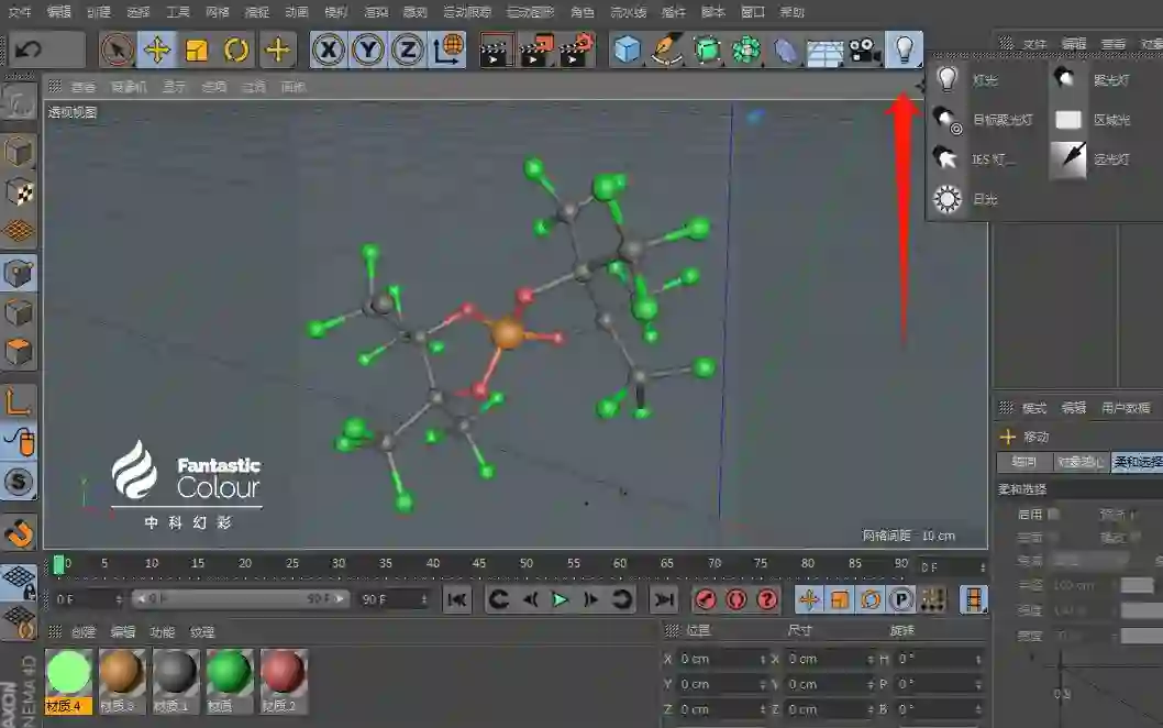 添加【灯光】,鼠标点击上面工具栏最右边的灯泡图标,选择自己想要添加的灯光方式单击进行灯光添加,通过上下拖动查看灯光效果,(通过键盘按键Ctrt+R)进行渲染浏览查看。如图26、图27所示: