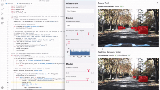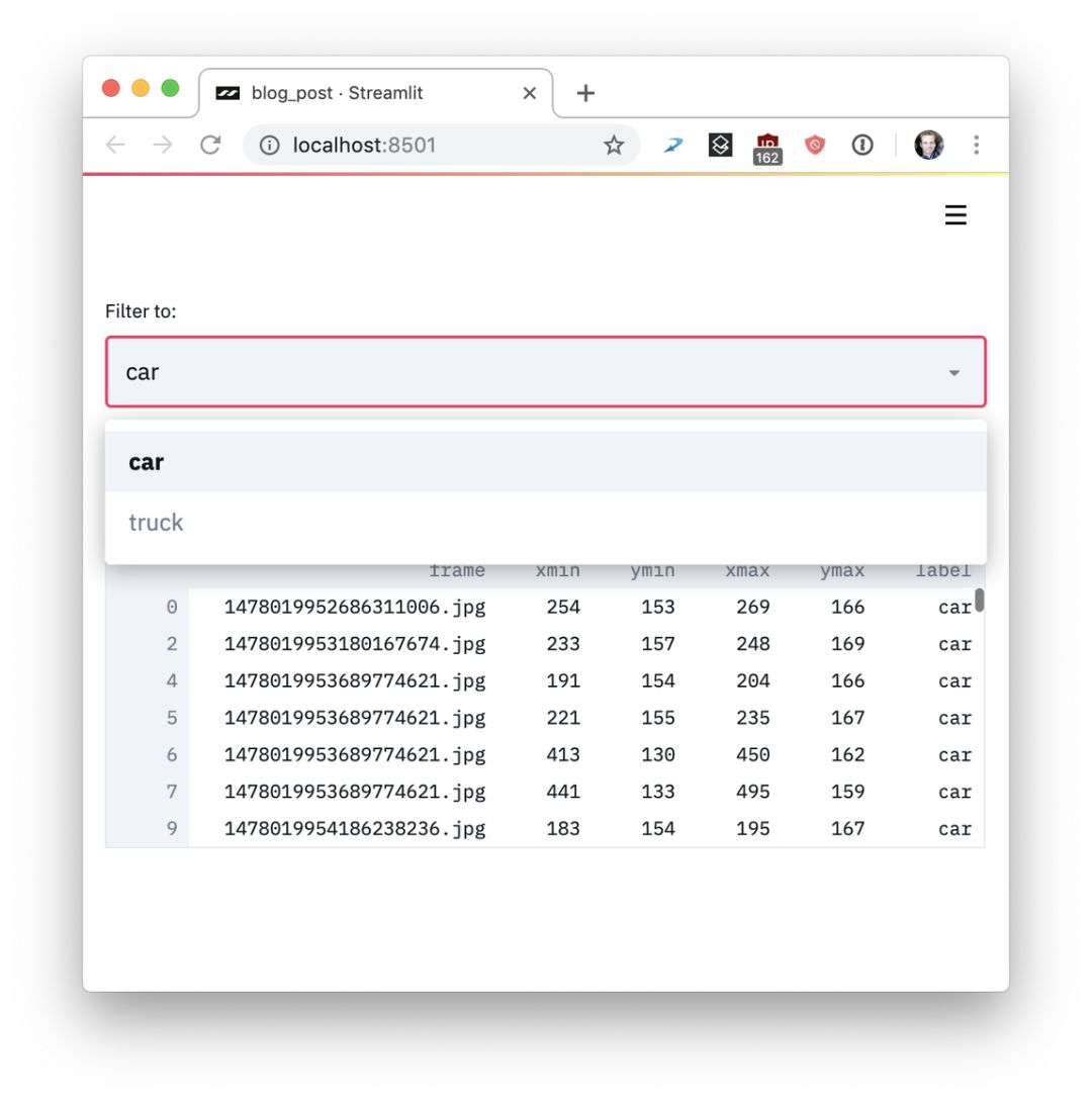 这些想法很简洁,但有效,使用 Streamlit 不会妨碍你创建丰富有用的 app。我在 Zoox 和 Google X 工作时,看着自动驾驶汽车项目发展成为数 G 的视觉数据,这些数据需要搜索和理解,包括在图像数据上运行模型进而对比性能。我看到的每一个自动驾驶汽车项目都有整支团队在做这方面的工具。