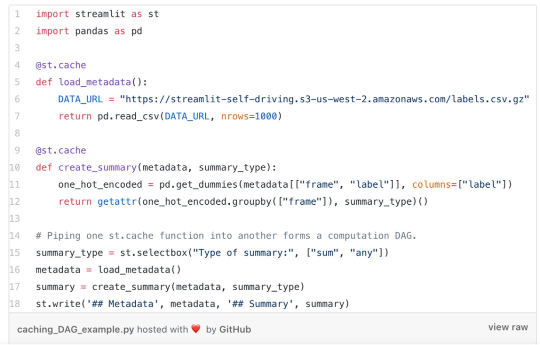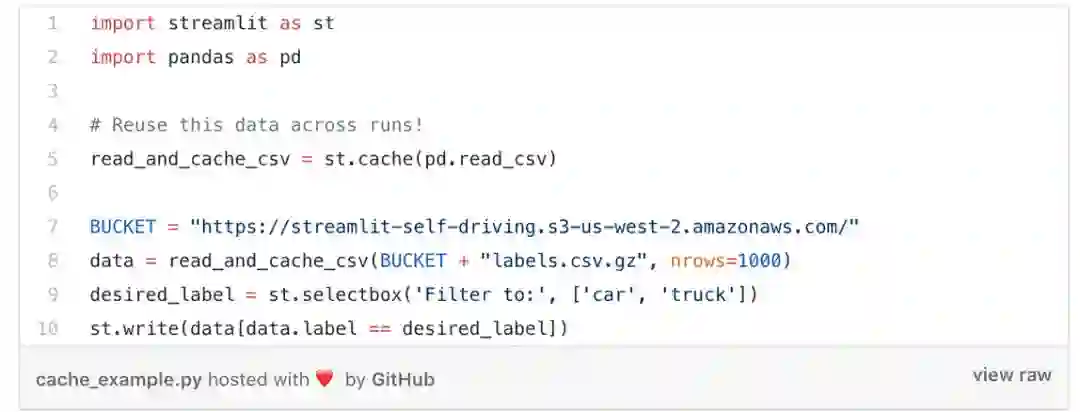 如果要下载大量数据或执行复杂计算,怎么办?关键在于在多次运行中安全地重用信息。Streamlit 引入了 cache primitive,它像一个持续的默认不可更改的数据存储器,保障 Streamlit app 轻松安全地重用信息。例如,以下代码只从 Udacity 自动驾驶项目(https://github.com/udacity/self-driving-car)中下载一次数据,就可得到一个简单快速的 app: