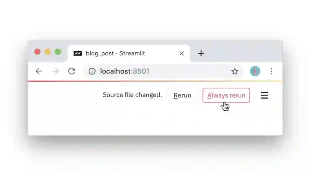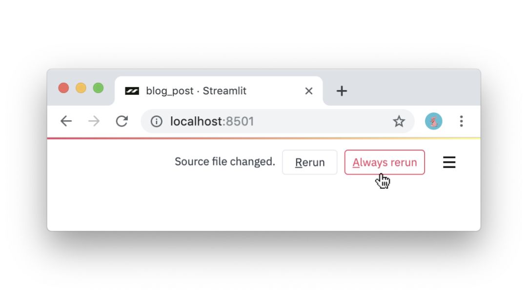 Streamlit 提供即时模式的编程环境。当 Streamlit 检测出源文件变更时,只需点击 Always rerun 即可。