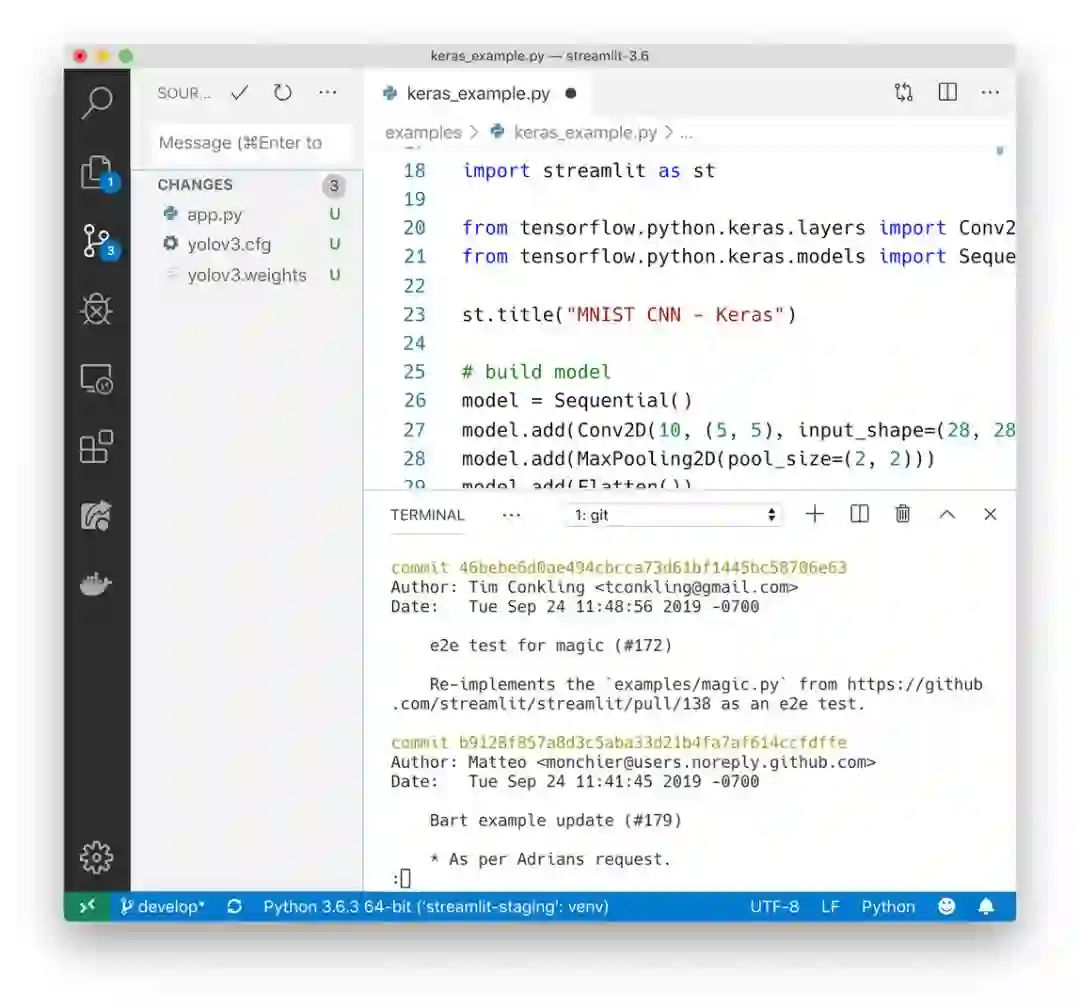 纯 Python 代码可与 Git 等源码控制软件无缝对接,包括 commits、pull requests、issues 和 comment。由于 Streamlit 的底层语言是 Python,因此你可以免费利用这些协作工具的好处。