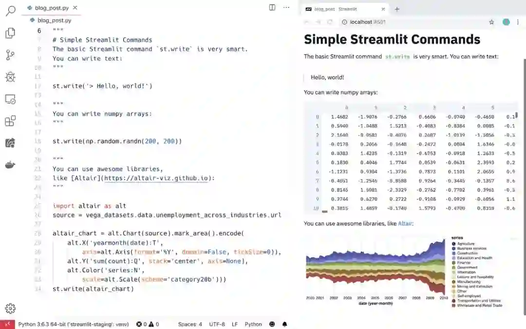 我用 Streamlit 构建 app 时喜欢用 VSCode 编辑器(左)和 Chrome(右)。