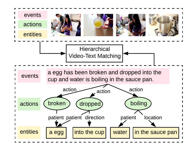 然后,不同层次的文本特征用于指导多样化的视频编码,视频也被编码为与事件、动作和实体相关的层次化表示。