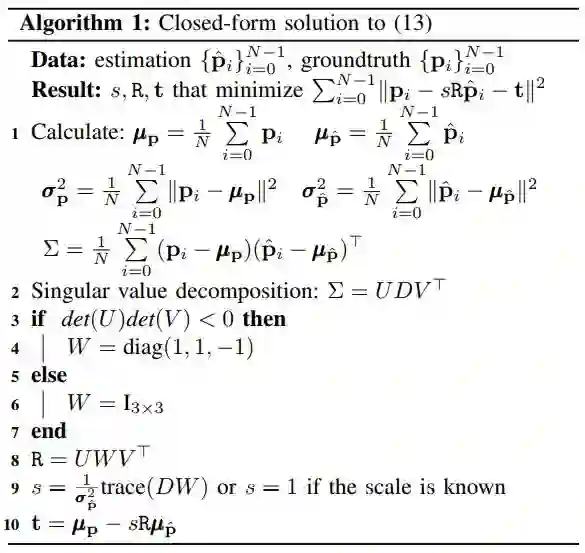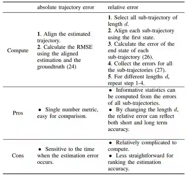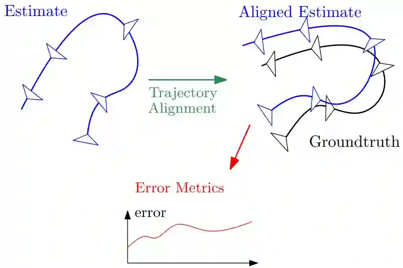 在本教程中,我们提出了通过视觉(-惯性)里程计(VO / VIO)定量评估估计轨迹质量的原则性方法,这是对不同算法的准确性进行基准测试的基础。首先,我们展示如何基于特定的感知模态(即单目,双目和视觉加惯性)确定在轨迹对齐中使用的变换类型。其次,我们描述了常用的误差度量(即绝对轨迹误差和相对误差)及其优缺点。