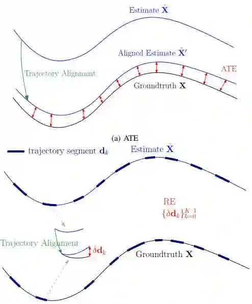 图4 绝对轨迹误差和相对误差说明,图中对齐后的误差在视觉上放大了,对于相对误差,轨迹段应该是所有满足特定判据的可能状态对。为了显示方便,它们在图中没有重叠。