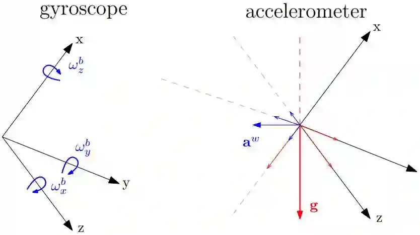 图3 IMU测量模型,如右图所示,如果本体坐标系绕重力方向(红色)旋转,本体坐标系的重力分量是不变的,而对于围绕任何其他轴的旋转,重力分量会改变。
