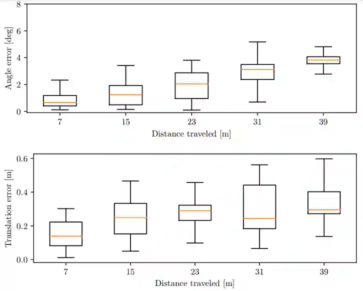 图7 不同轨迹长度的相对平移误差和相对旋转误差显示为一系列方框图,方框图的中间显示所有估计误差的两个四分位数。