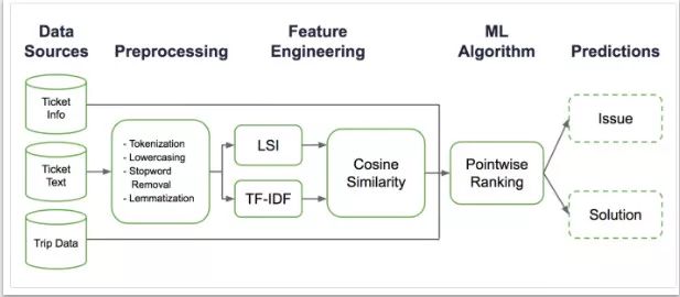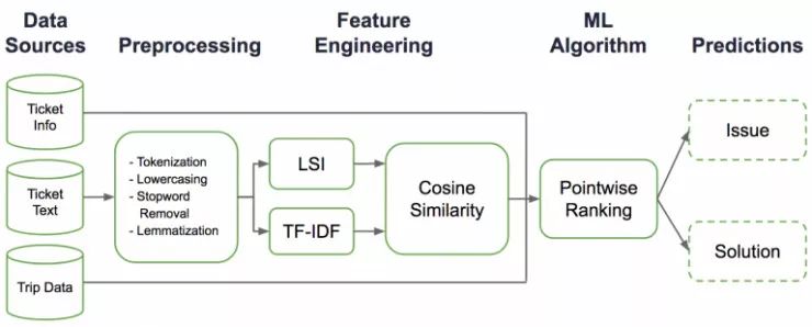 图 3:为识别工单问题类型和选择解决方案,我们建立的 NLP「管道」模型由三个不同的步骤组成:预处理,特征工程和基于点的排序算法。