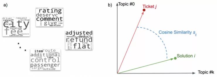 图 4(a)主题建模:我们使用 TF-IDF 和 LSA 从文本数据中提取主题;( b)特征工程:将所有工单解决方案和工单问题映射到主题向量空间,计算解决方案和工单之间的余弦相似度