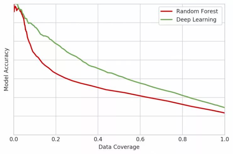 在下图中,我们展示了工单集的数据覆盖率(模型正在处理的工单百分比,x 轴)和准确度(y 轴)之间的关系。如下所示,随着数据覆盖率的降低,两种模型都变得更加精确,但是我们的深度学习模型在相同的数据覆盖率上表现出更高的准确性,在相同准确度下表现出更高的数据覆盖率。