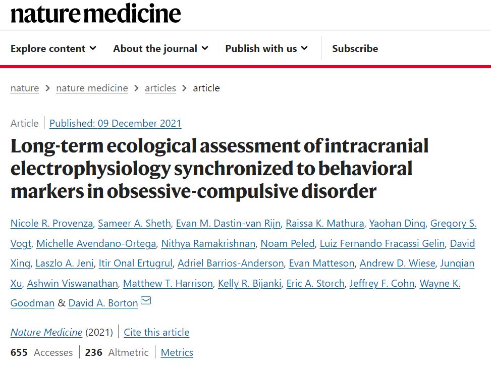 该研究以“Long-term ecological assessment of intracranial electrophysiology synchronized to behavioral markers in obsessive-compulsive disorder”为题,发表在最近一期的 Nature Medicine 杂志上。