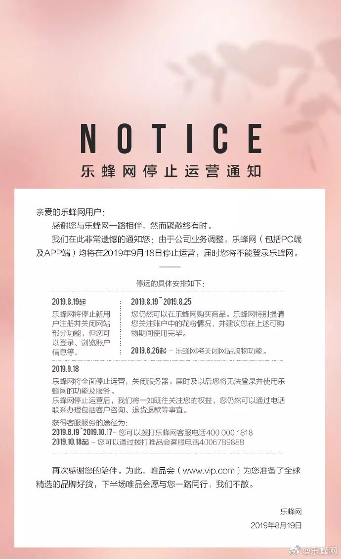 乐蜂网官方公众号也发布消息称,从即日起停止发布更新信息,并申请后台注销账号。乐蜂网表示,用户仍然可以通过电话联系办理包括客户咨询、退货退款等事宜。