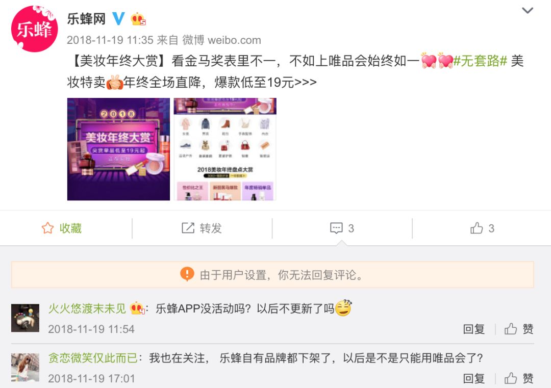 而新上线的小编除了表示自己身份外,发布的第一条微博,“不如上唯品会始终如一”,疑似为唯品会引流。并有微博用户在底下留言,“乐蜂自有品牌都下架了,以后是不是只能用唯品会了?”