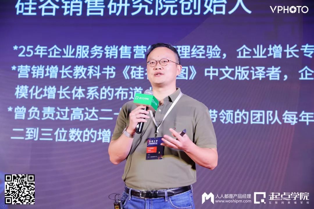 第二天首位分享的嘉宾,是硅谷销售研究院创始人蔡勇老师,他分享的主题是《产品经理如何思考规模化增长》: